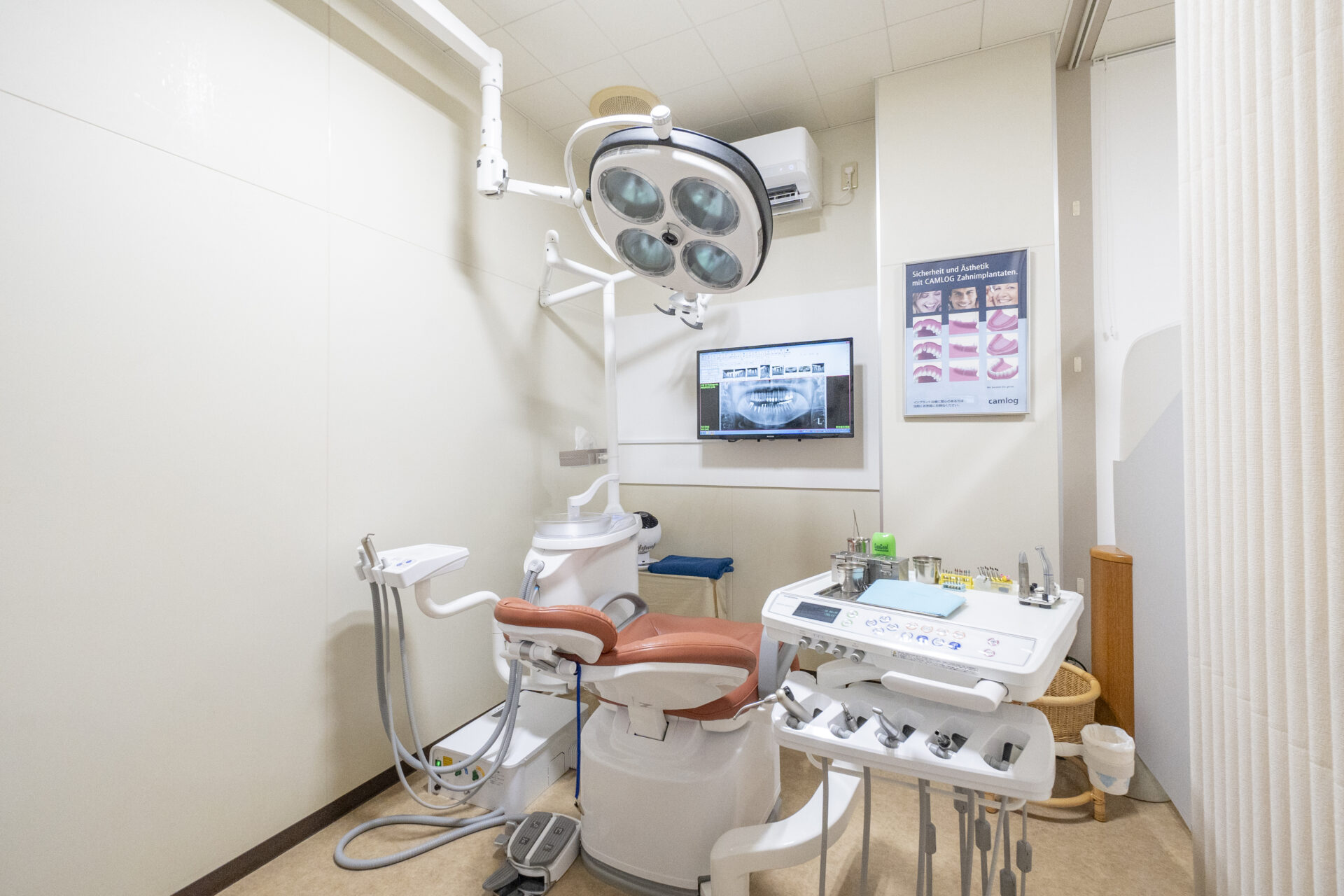 インプラント手術や親知らず歯の抜歯の際に使用します。手術中、手元に影が生じないように無影灯を設置しておりますので、見えにくいところも、しっかり確認しながら手術をしております。